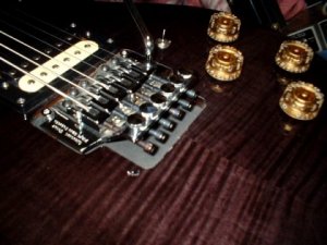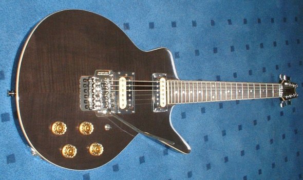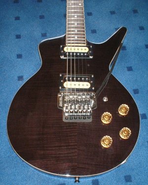 ..und wieder.... - Erlebody mit Ahorn-Decke, sowie frontseitig umlaufendem Binding - eingeleimter Ahornhals mit Palisandergriffbrett & Binding - 22 Medium Bünde - licensed Floyd-Rose-Tremolo - Lackierung in "translucent-black"